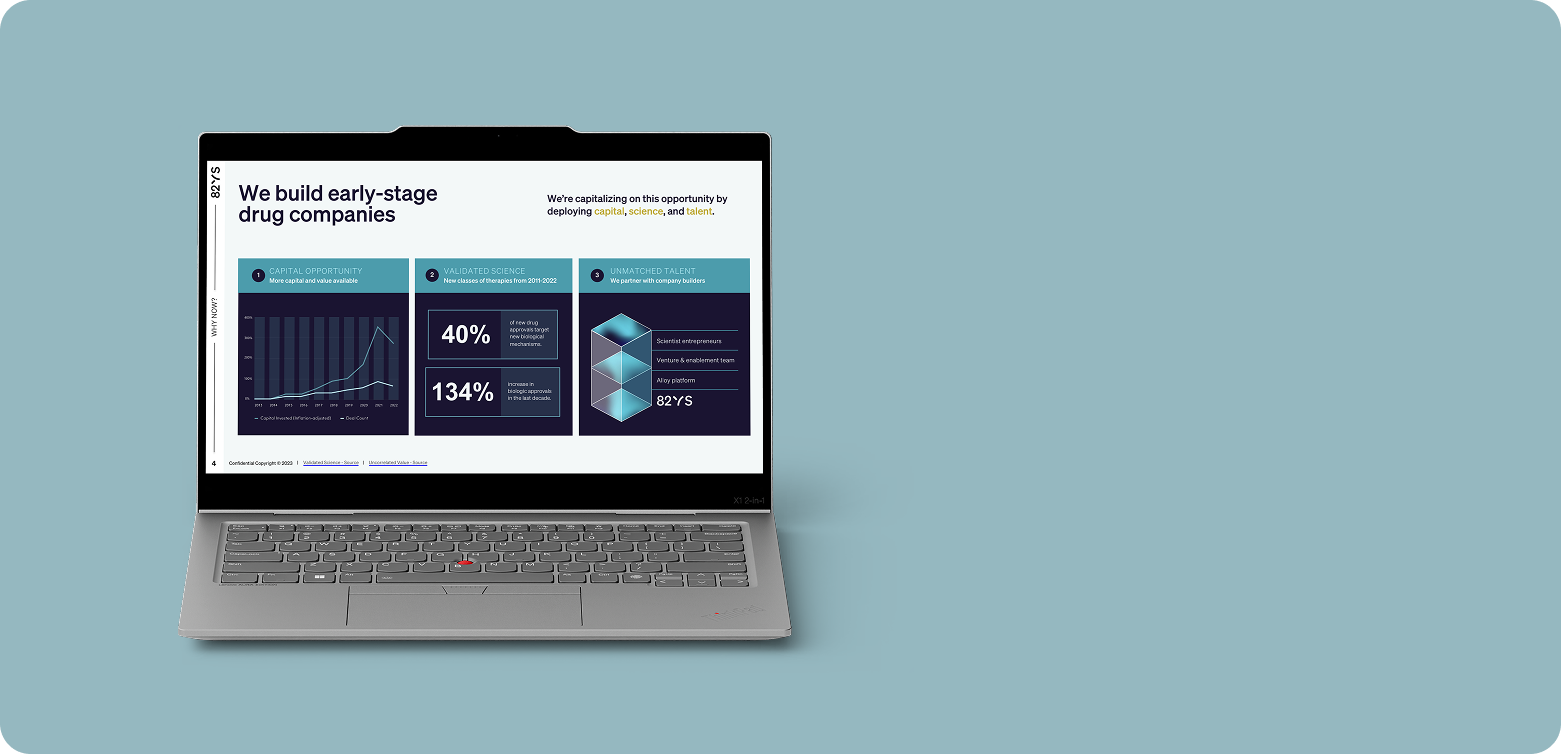 We’ve helped companies raise over $100 million with decks that do the heavy lifting. From Series A pitch decks to enterprise sales presentations, we’ve designed more than 200 decks across biotech, tech, and health. Our process is fast, strategic, and dialed in! Informed by what investors and buyers actually want to see.